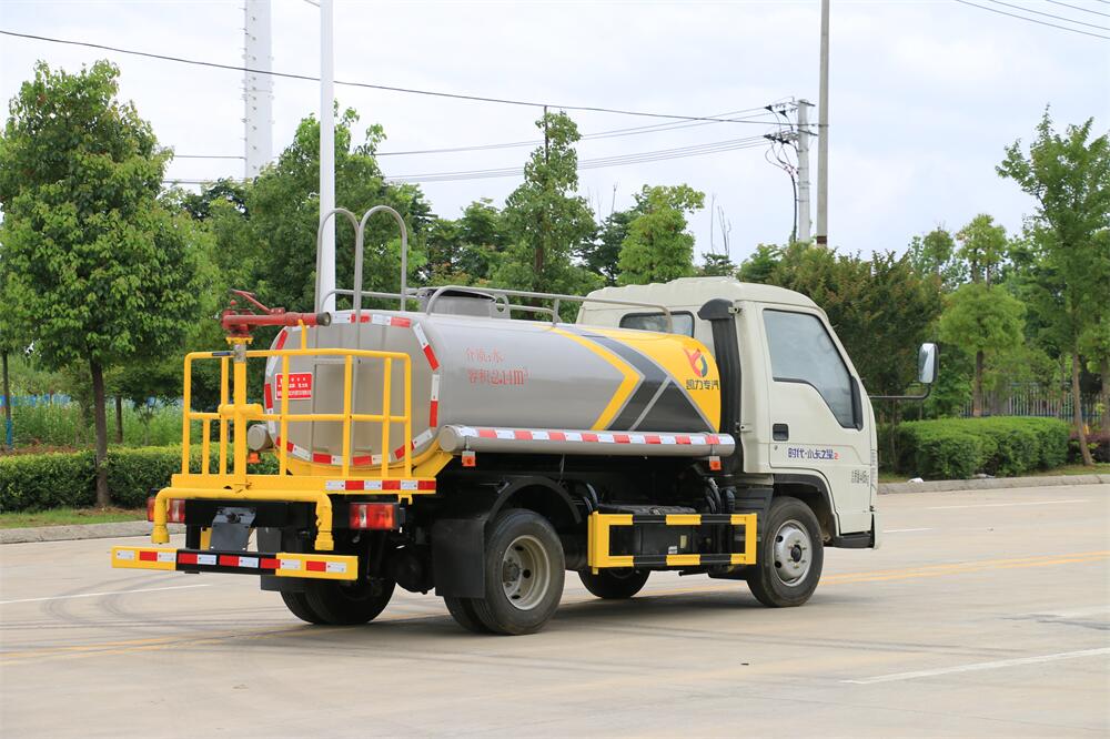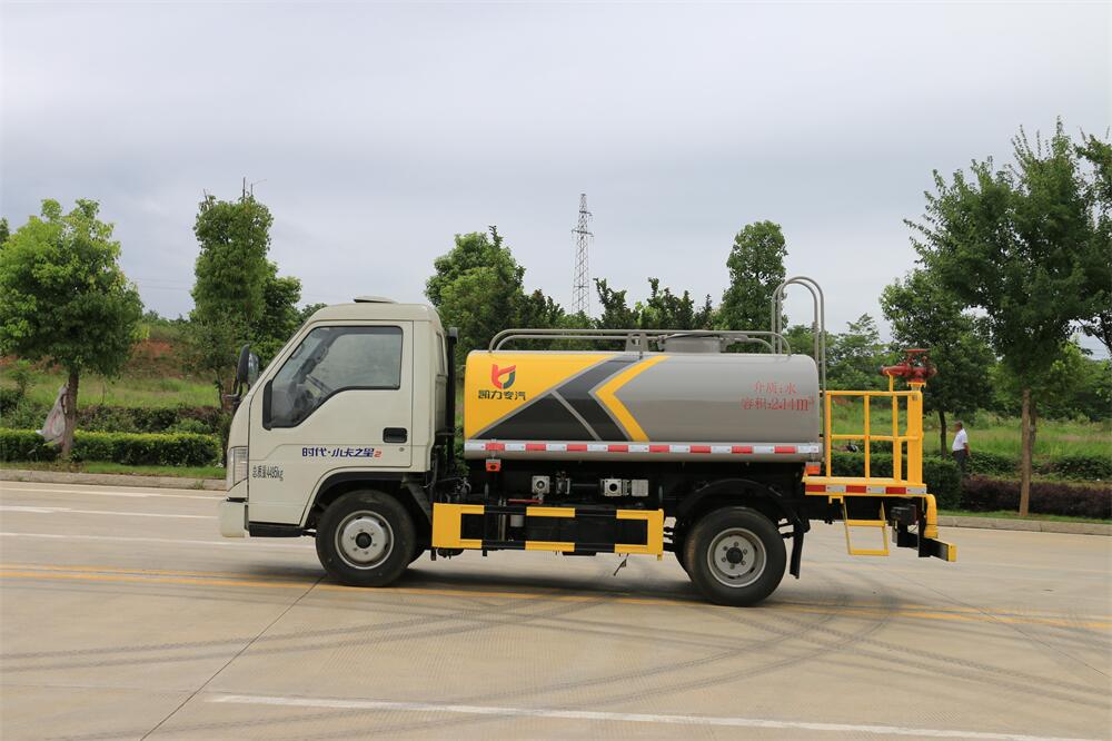 灑水車前裝有鴨形噴嘴或圓頭沖嘴,后面裝有圓柱開灑水噴嘴或蓮蓬頭噴嘴,后部有一工作平臺,裝配有水炮。后部還可裝8個噴嘴(選裝)。