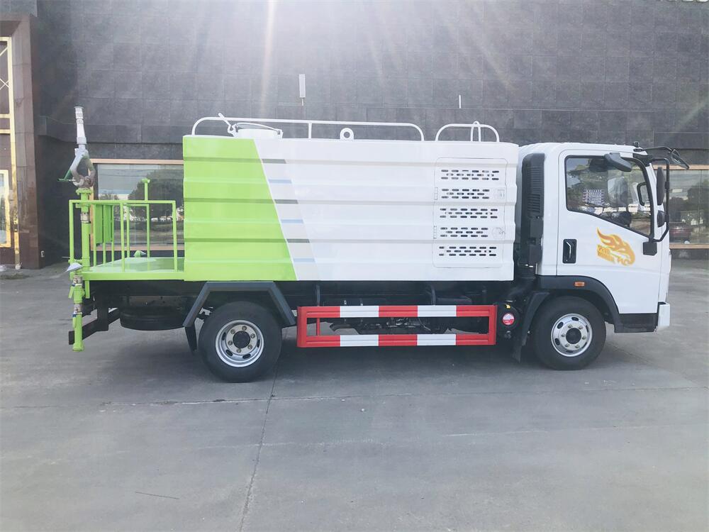 灑水車前裝有鴨形噴嘴或圓頭沖嘴,后面裝有圓柱開(kāi)灑水噴嘴或蓮蓬頭噴嘴,后部有一工作平臺(tái),裝配有水炮。后部還可裝8個(gè)噴嘴(選裝)。