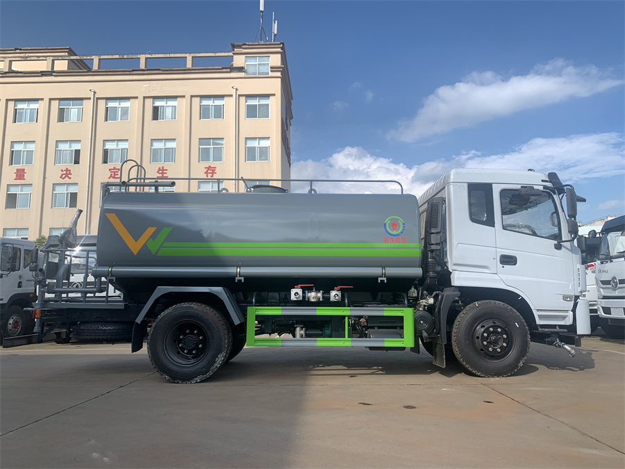 灑水車前裝有鴨形噴嘴或圓頭沖嘴,后面裝有圓柱開(kāi)灑水噴嘴或蓮蓬頭噴嘴,后部有一工作平臺(tái),裝配有水炮。后部還可裝8個(gè)噴嘴(選裝)。