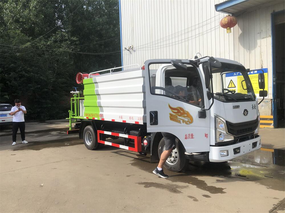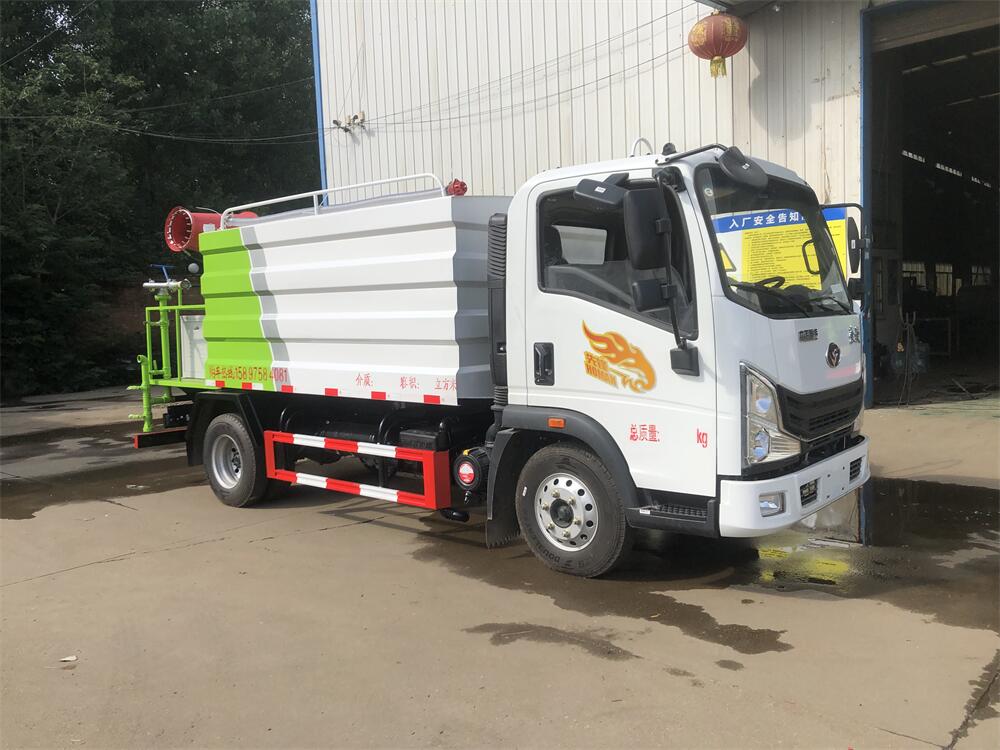 上裝配置:罐體容積為 5-7立方,選配風送式霧炮機組射程30米、40米、50米、60米、80米、100米、120米霧炮,罐體鋼板為4mm碳鋼Q235材質,罐內隔板具有防波作用,以減輕汽車行駛時罐體液體沖擊,罐體及整車外形尺寸按照公告。帶大功率專用灑水泵,泵可自吸自排,整車前沖、后灑、側噴、帶65消防接口,后平臺配CLW-50、CLW-60、CLW-80、CLW-100、CLW-120型風送式霧炮機組;罐體前封頭配大功率柴油發電機組;前封頭帶水位計,后平臺主管路帶1寸澆花接口,后爬梯。帶兩根輸水管及陰陽端。罐體顏色:銀/灰/綠,罐體兩側噴“多功能抑塵車”字樣,貼反光標示。