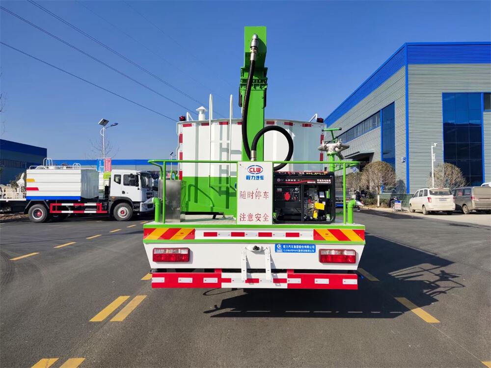 東風D9多功能鐵路抑塵車,整車型號:CL5186TDY6YC,底盤型號:EQ1185LJ9CDE,總質量:18000KG,整備質量(車輛自重):9660 KG,額定載質量:(上戶噸位):8145KG,4500軸距,大容積罐體滿載15立方(罐內采用環氧玻璃鱗片防腐處理質保兩年)、新穎的罐體設計使車輛行駛更穩定、使用壽命更長,大容量方型水箱,前沖、后灑、側噴、高炮,抑塵噴灑桿(帶旋轉升降功能,液壓升降、液壓旋轉)。噴灑桿離地3.5-5.6米 、180°旋轉,后部平臺帶8KW柴油發電機組、電控箱。整車采用全智能駕駛室觸摸屏及遙控操作:車輛噴淋系統、攪拌、旋轉臂、加熱等等功能。灑水功能采用主機動力。旋轉、升降、攪拌采用發電機組動力,配電箱預留外接電源接頭套。噴淋系統加裝單車流量計(用于計量抑塵劑噴灑量。)