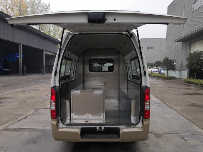 產品簡介 1. 主要配置:前空調,前暖風,電動車窗,ABS+EBD, 遙控鑰匙2. 改裝部分采用304L不銹鋼制作,中間不銹鋼隔墻安裝拉窗,不銹鋼地板,不銹鋼常溫棺不銹鋼擔架,加兩側玻璃下不銹鋼裝飾 ,根據您的要求設計改裝方案,模板一次成型,隔墻密封,拒串味??梢詮S家自提,也可以付定金貨到付款。(冰棺選裝,后空調選裝,可視系統選裝,對講系統選裝)